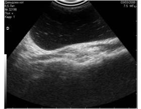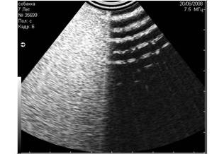 Рис. 14. УЗИ предыдущего животного. Изменение угла наклона датчика помогает избежать ошибки. |