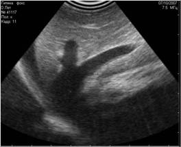 Рис. 15. Режущие тени от кривизны стенок желчного пузыря. Эти тени подчёркивают другой артефакт - артефакт периферического усиления. |