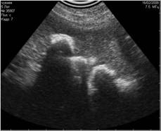 Рис. 8. На снимке представлен гиперэхогенный объект в полости мочевого пузыря, испускающий эхоакустическую тень. На основании этого артефакта, мы можем предположить, что этот объект является конкрементом. |