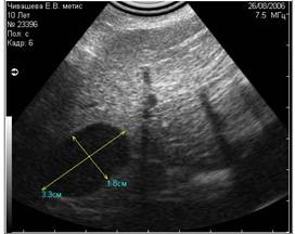 Рис. 19. Артефакт периферического усиления, возникший позади желчного пузыря. |