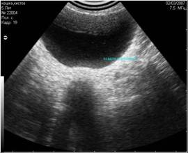 Рис. 26. Артефакт зеркального отражения мочевого пузыря от брюшины при перитоните. |