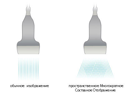 В этом специальном режиме сканирования B датчик передает звуковые волны не только перпендикулярно, а также и в других плоскостях, вращая направление распространения волн. Затем эти плоскости перекрываются и формируют конечное изображение. Это улучшает пространственное и контрастное разрешение и уменьшает отражения на границе.